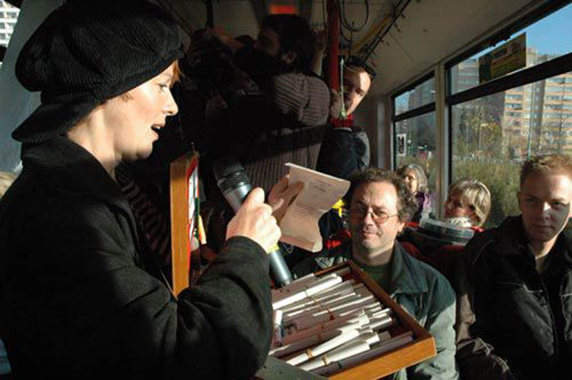 | · Rosa Valetti mit dem politischen Bauchladen Verkauft wurde: Das Deutsche Los. Szenen zum 09. November 1918, 1938 und 1989. Zur politischen Kunstaktion „MARZAHN FÄHRT AB AUF (GE)DENKEN – mit der Straßenbahn durch die Deutsche Geschichte“ kamen Künstler und Politiker aus vielen Teilen des Landes zusammen, um den Passagieren der M8, die für diese Aktion zur fahrenden Bühne wurde, ihre Ideen und Gedanken zum Thema 09. November in Deutschland vorzustellen. |